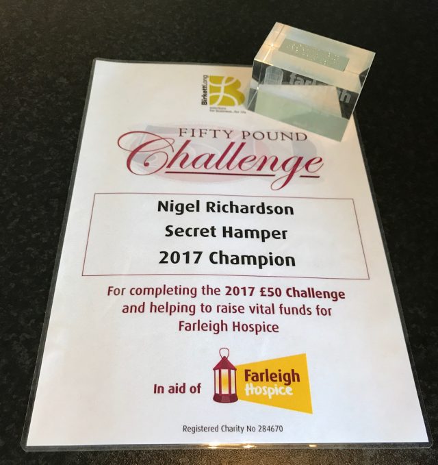 Secret Hamper awarded top fundraiser at the Farleigh Hospice £50 challenge finale.