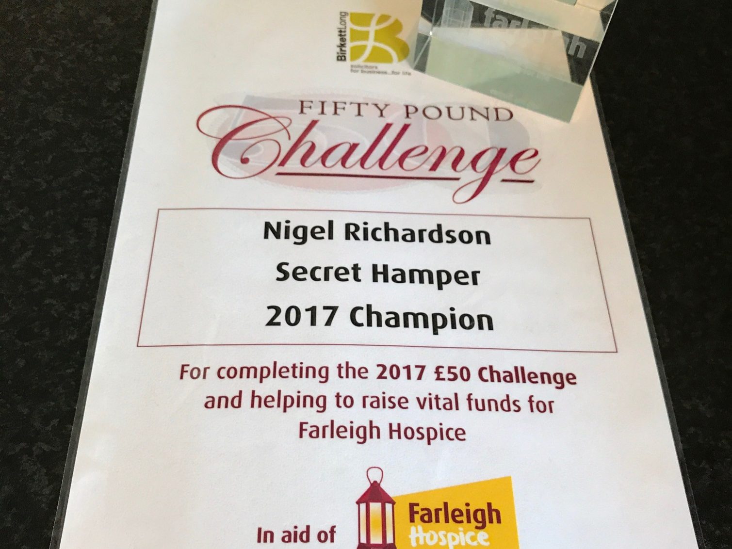 DetailsSecret Hamper awarded top fundraiser at the Farleigh Hospice £50 challenge finale.